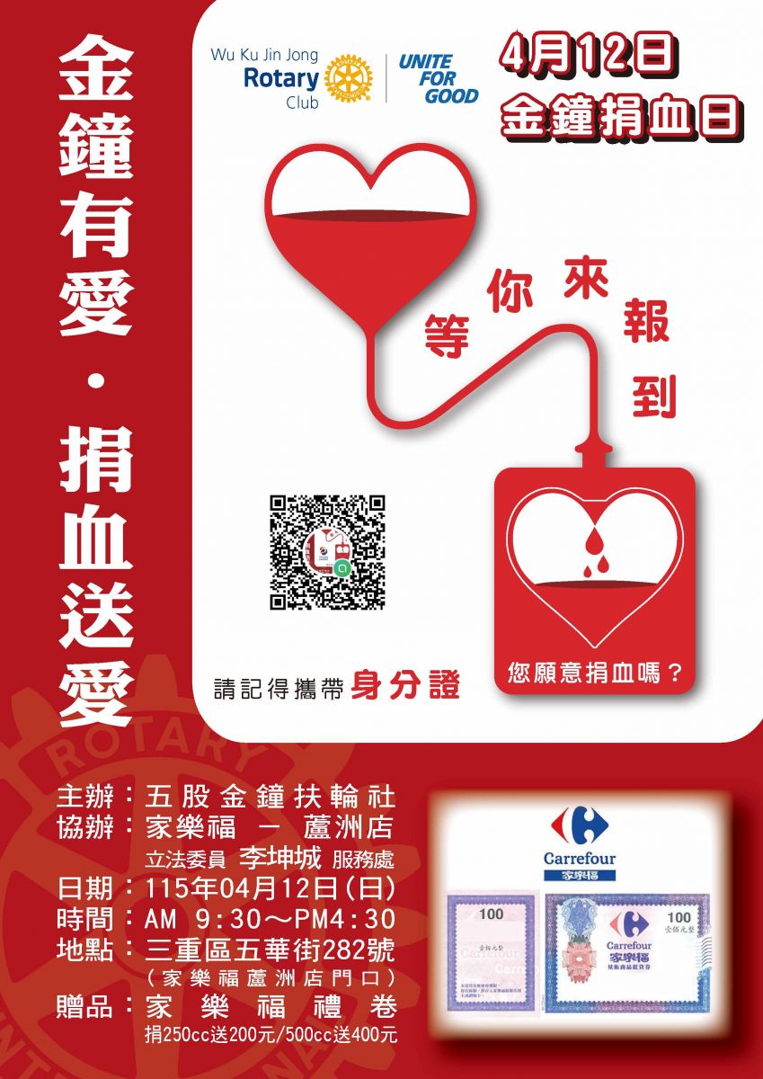 - 本社4/8(三)晚上例會延後與本次捐血合併舉行。